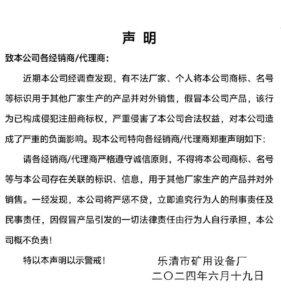 聲 明致本公司各經銷商/代理商:近期本公司經調查發現,有不法廠家、個人將本公司商標、名號等標識用于其他廠家生產的產品并對外銷售,假冒本公司產品,該行為已構成侵犯注冊商標權,嚴重侵害了本公司合法權益,對本公司造成了嚴重的負面影響?,F本公司特向各經銷商/代理商鄭重聲明如下:請各經銷商/代理···